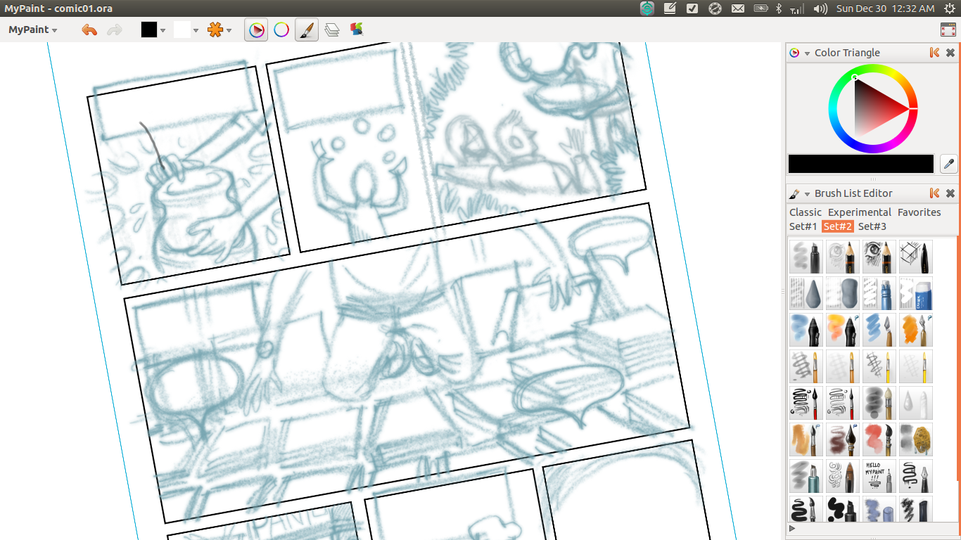 My drawings have improved slightly over the past few issues though. I use the awesome Mypaint for drawing and Inkscape for layouts and text. Mypaint has been steadily getting better over the years. The layers feature allows me to make a rough sketch in blue pencil. I can then Ink and colour in separate layers.