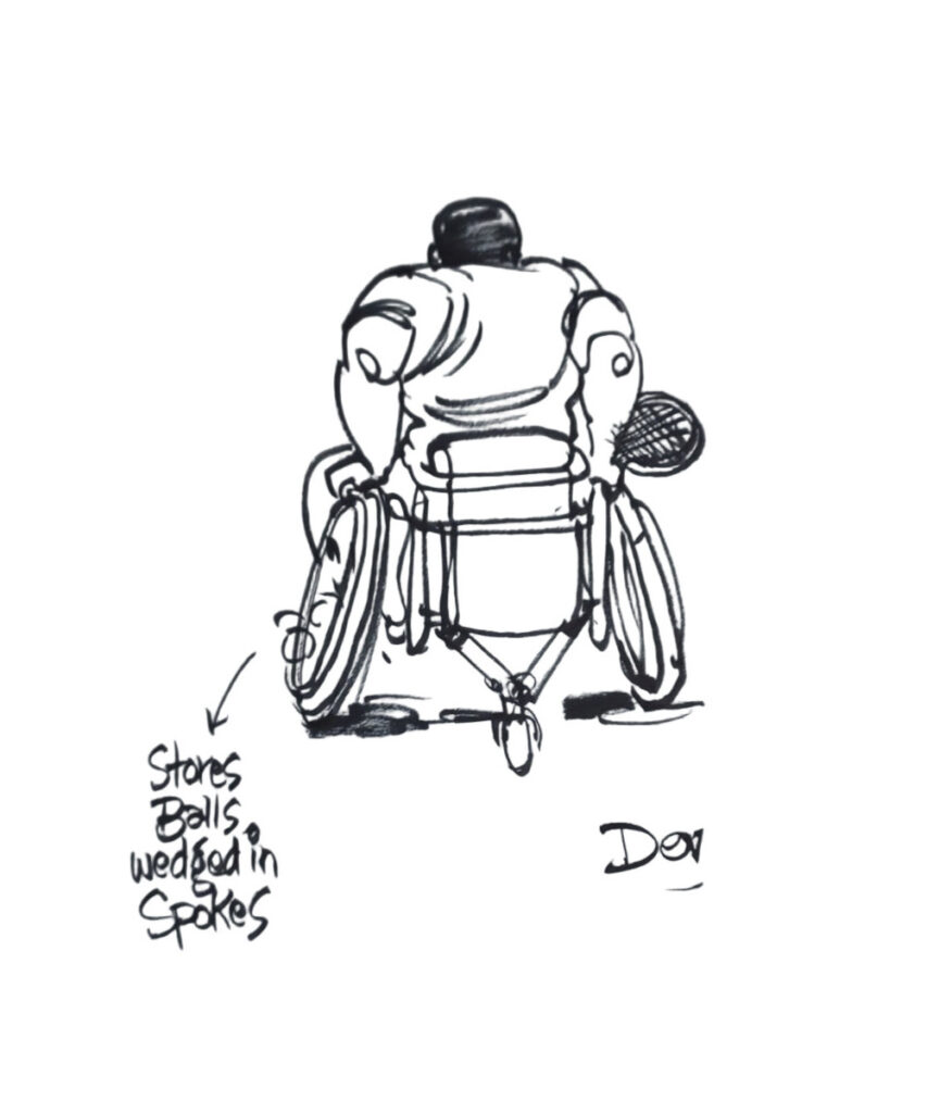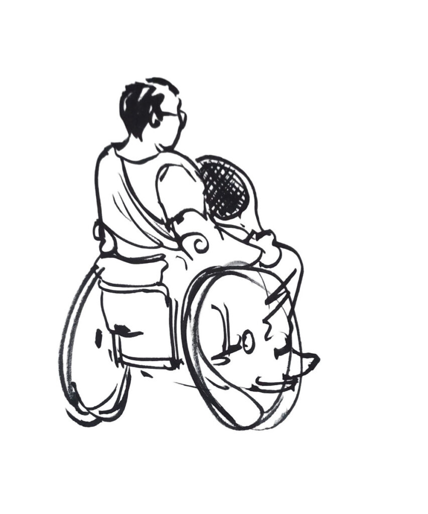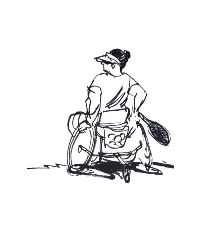 It was great to study how the players move. They have to predict where the ball will be, which in turn requires them to predict how the other player will counter the shot. So using wheelchairs to move laterally across the court to put themselves where the ball will be, requires the ability to manoeuvre the machine and predict, which makes this game far more complicated than regular tennis. Now, I don’t know anything about tennis or the rules of tennis tournaments, but I really enjoyed watching the players and breaking down their movements into lines in my sketchbook.