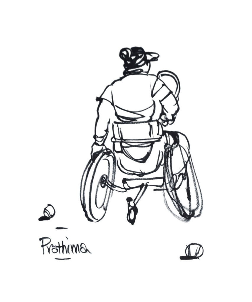 We jammed at Kanteerava Stadium yesterday. After drawing the archers for a bit, I walked over to the adjoining court, which had Wheelchair Tennis Players. I discovered later that one of the players I drew was Prathima Rao, who has represented India in international events and won the Indian Wheelchair Tennis Tournament, TABEBUIA OPEN five years in a row.